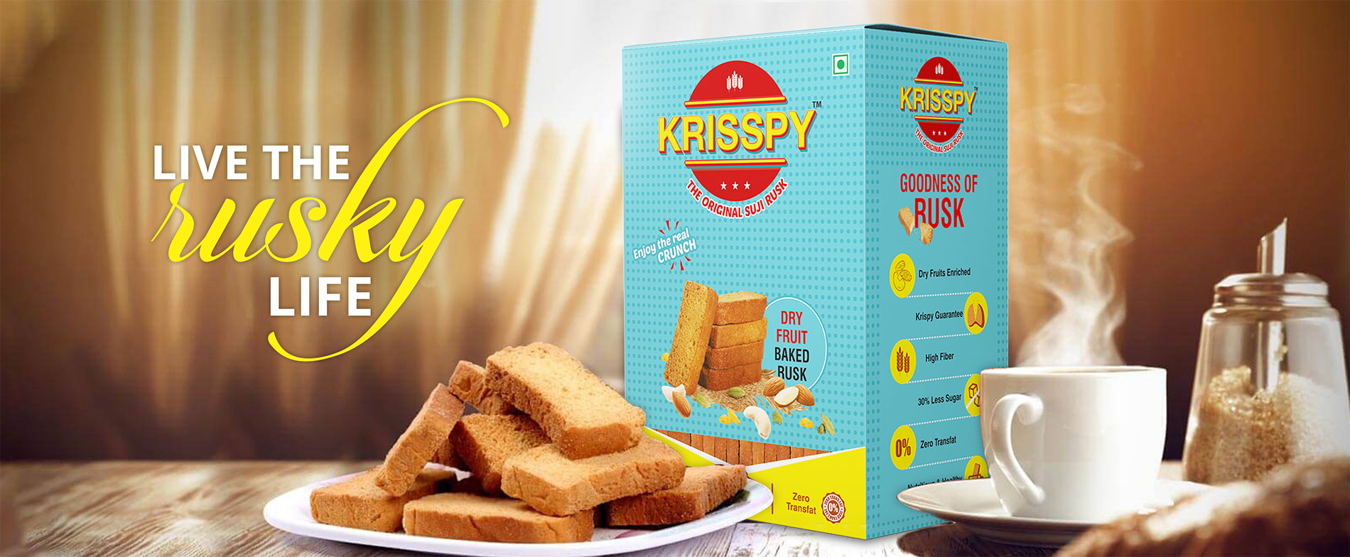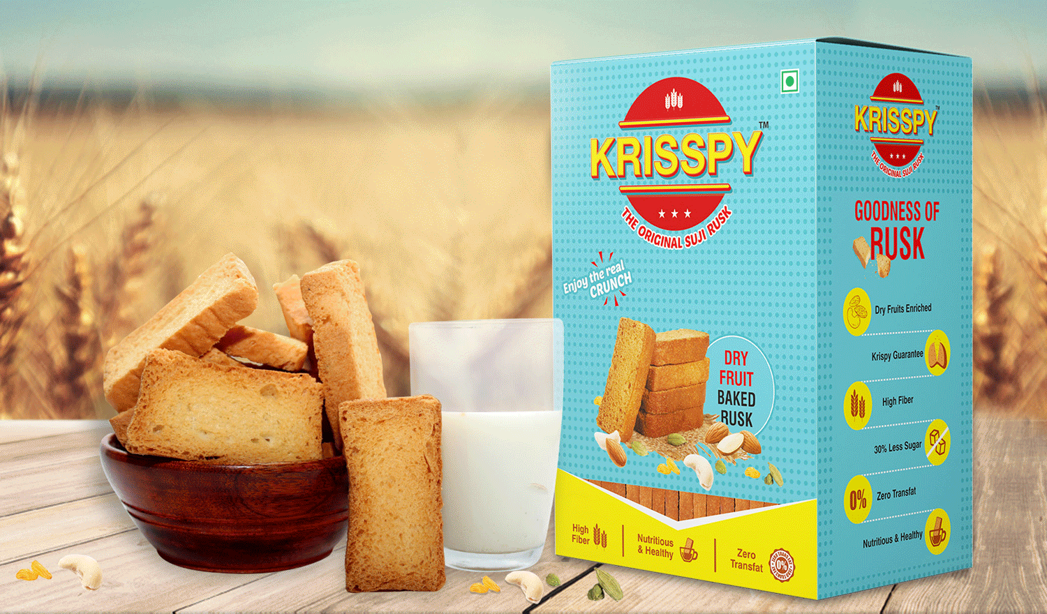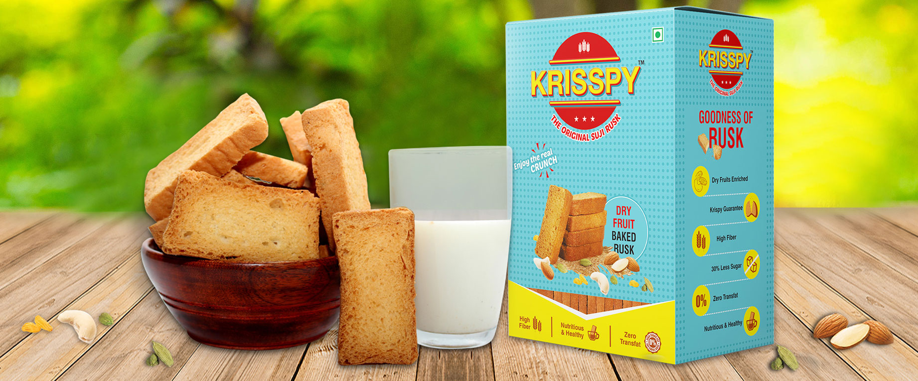 The perfect snack for health-conscious people. Krispy Suji Rusk has the right amount of sweetness, savour and crunch to make every bite a sheer joy. Made from high-quality Suji and Dry Fruits (almonds, cashew nut & cardamom) every Suji Rusk is baked to perfection and packed at our state-of-the-art facilities to ensure that the highest quality reaches our customers.
